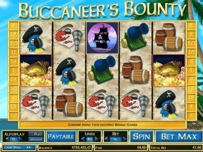 A swashbuckling tale, Buccaneer’s Bounty is a 5 reel 5 line video slot. It has a top award of a 10,000 line multiplier, and coin values from 0.01 to 5.00. Up to five coins can be placed on a line, which gives the player a chance to win a pirate’s bounty. With an amusing Bonus round, Buccaneer’s Bounty has both the basics and the extras that can make any player happy. The theme is complemented by icons such as skull-and-crossbones flags, bottles of rum, crossed swords and so on. There are two main icons that you will want to reveal: the treasure chests and the map icons. Matching the treasure chest five times in a row across a pay line will drop you the top award.