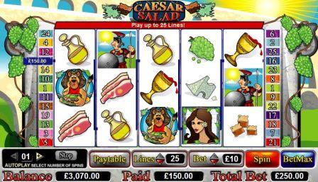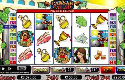 Caesar Salad is a 5 reel, 25 line video slot based on a comedic version of a Roman leader. The Caesar Salad slot has coin values of 0.01 to 10.00 which can be placed on a maximum of 25 lines. This gives players a wide range to gamble with. Any player has an opportunity to win big and live a decadent Roman lifestyle. With scatter symbols, wild icons, and free spins that include a multiplier of your total winnings, this is a slots game that deserves its adoring public. The game’s icons are based upon this victorious ancient culture.