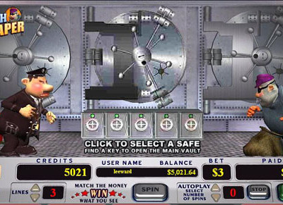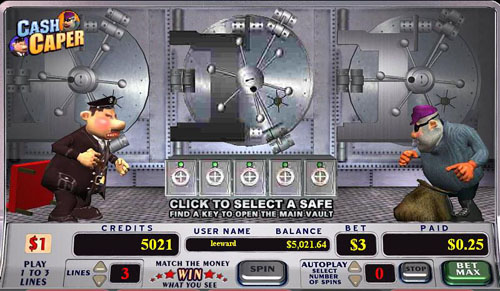The bonus game offered on Cash Caper $0.25 Slots was activated whenever a money bag symbol was created anywhere on the screen. When this happened players were taken to a different screen and told to choose from five different safes. Clicking on one of the safes, a prize was awarded and the game was ended unless a key was found in the safe. If the key was obtained, players were taken to yet another screen and allowed to spin a wheel. There were several different numbers on the wheel and whatever one was landed on dictated the number of free spins that would be awarded.