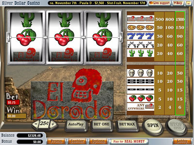 El Dorado Slots is a basic slot game with three reels and three pay lines, designed by Vegas Technology. Although not the most interesting game, it does give players fairly consistent pay-outs at a fairly frequent rate.