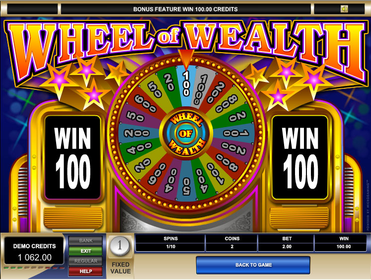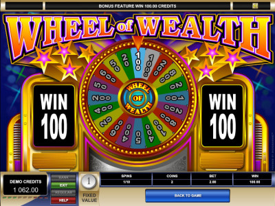 If you bet two coins and land a Spin symbol on the third reel, the Wheel of Wealth bonus game is triggered on a separate screen. The prize you are entitled to is determined by spinning a wheel and seeing which prize you land.