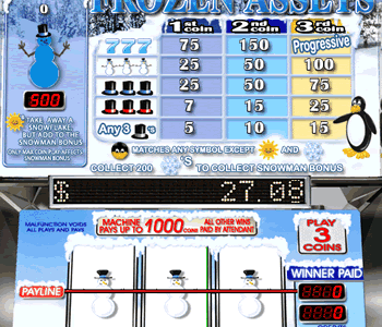 Frozen Assets is among the 3-reel slot games from Cryptologic Slots. Colorful and fun the pay table is displayed on the front of the machine. Wagers may be placed in the amounts of $.05, $.25, $.50, $1, and $5.