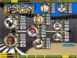 Gladiator’s Gold Slots is one of many simple slot games powered by Vegas Technology. There are a total of five reels and five pay lines and the maximum number of coins you can bet is five, making that a total of $50.