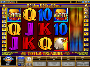 Golden Goose Totem Treasures is a five reel, twenty pay line video slot machine. Bets start at once cent and can go as high as twenty cents. To place a maximum bet requires a wager from twenty cents up to four dollars a spin, to put the maximum bet value at two-hundred-fifty dollars.