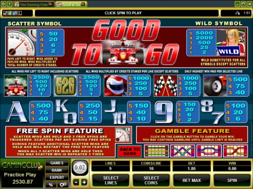 The Good to Go Slot game was a huge hit from the start: Motor racing fans love the combination of their passion for fast action with the thrill of online gambling on this colorful Formula One online video slot machine. Good to Go is a five reel, nine pay line, ten coin game, with Wild and Scatter symbols as well as a Free Spin feature.