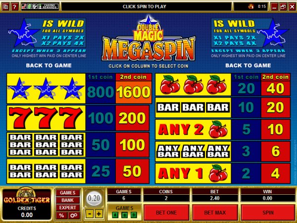 The highest payouts per individual slot in descending order are 1600, 200, and 100 coins earned by getting 3 consecutive stars, 7’s, and triple bars respectively (14,400 coins being the biggest possible payout if sorcery truly is afoot). You can bet anywhere from 10 cents to 5 dollars, and make all 9 slots purr simultaneously for the low price of $1.80.