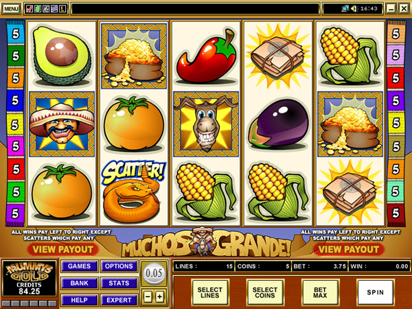 Much in the vein of “Monster Mania,” the 5-reel, 15-payline slot game “Muchos Grande” offers the ability to gamble for cash or play for free; the former option with bets from as low as a penny to 50 cents, allowing up to 50 cents per payline and can yield up to 9000 coins.