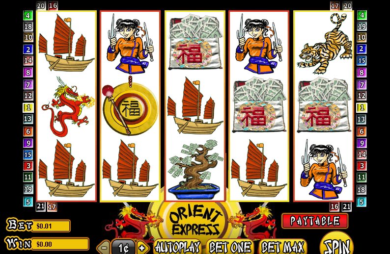 The Orient Express is a five reel, twenty-one pay lines video slot machine with an Oriental theme. There are twenty-four winning combinations; also, there are no wild, multiplier or scatter symbols used in this game.